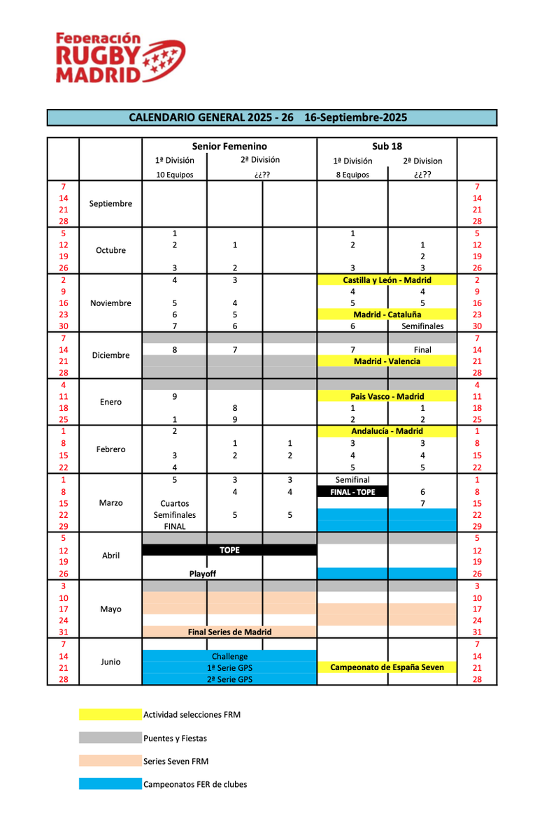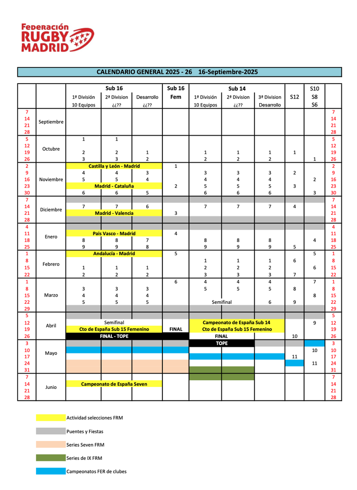 Las horarios son genéricas. Los campos y horarios se confirmarán a principios de la semana del partido Las Jornadas FRM para Sub12 y Sub10-8-6 siempre son los sábados por las mañana.